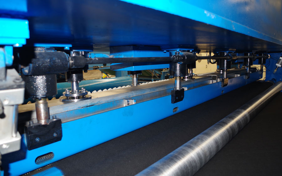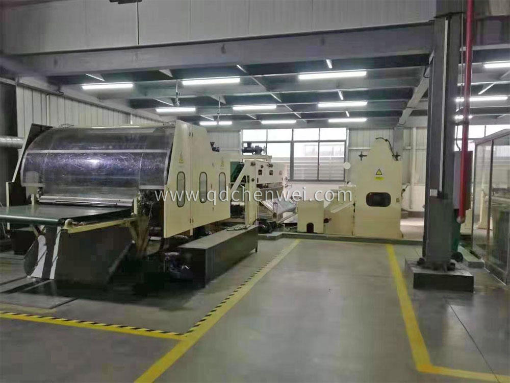 5. CWPW-鋪網(wǎng)機(jī):用于將梳理纖網(wǎng)通過移動小車交叉折疊為所需幅寬和定量的多層纖網(wǎng),以供后道工序使用。鋪網(wǎng)輥采用特殊結(jié)構(gòu),加裝壓網(wǎng)輥和導(dǎo)流板,不飄網(wǎng)不起皺,五只大功率電機(jī)精確控制各部件的運動,電動輸出簾高度調(diào)節(jié)裝置