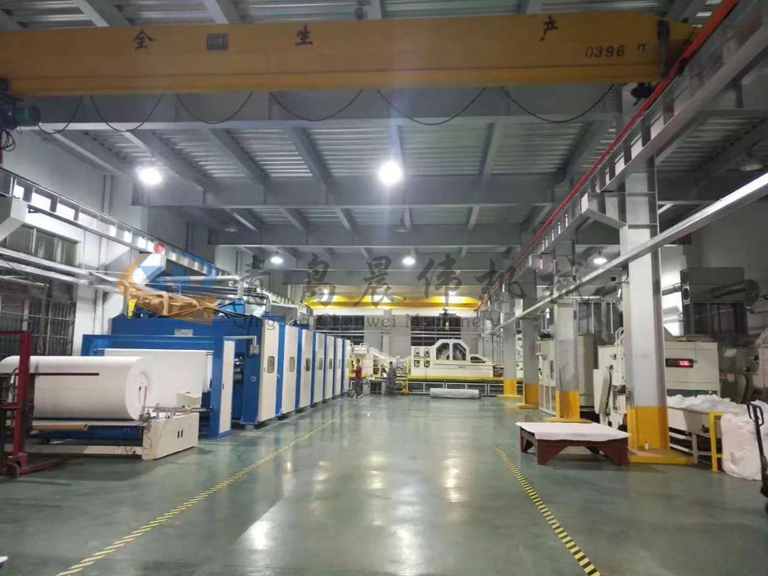 開包機(jī)-開松機(jī)-振動(dòng)給棉機(jī)-梳理機(jī)-鋪網(wǎng)機(jī)-針刺機(jī)-切邊成卷機(jī)
